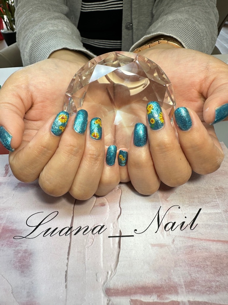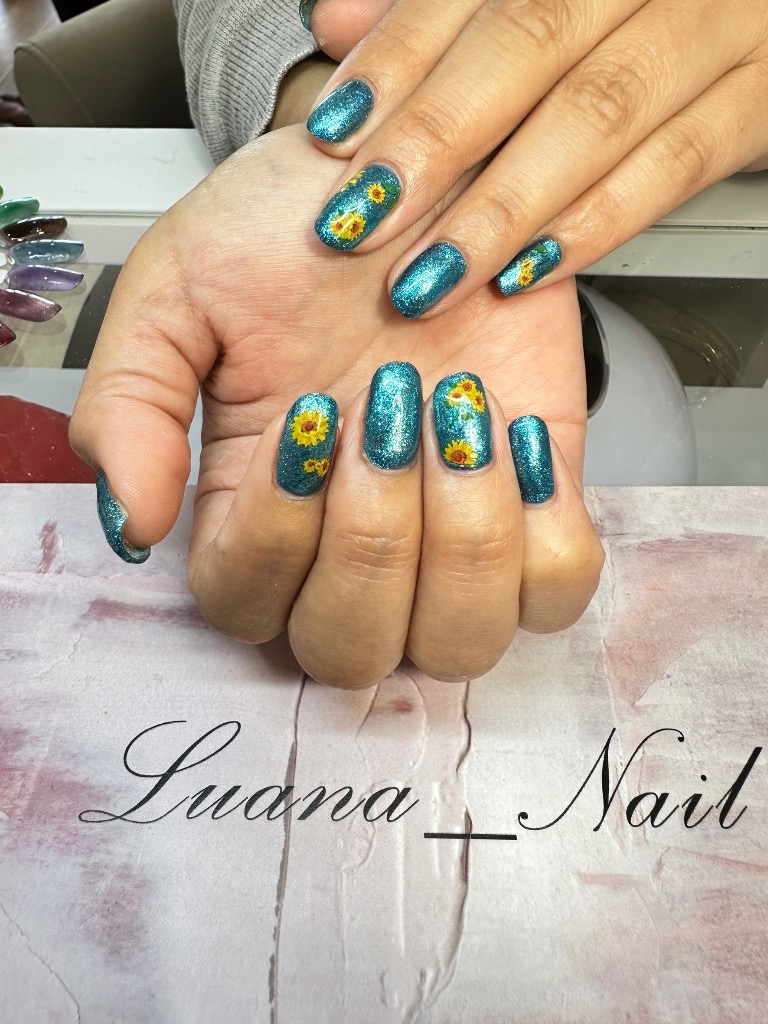 ブルーラメのベースにひまわりアートの組み合わせで夏らしいデザインに仕上がりました😊