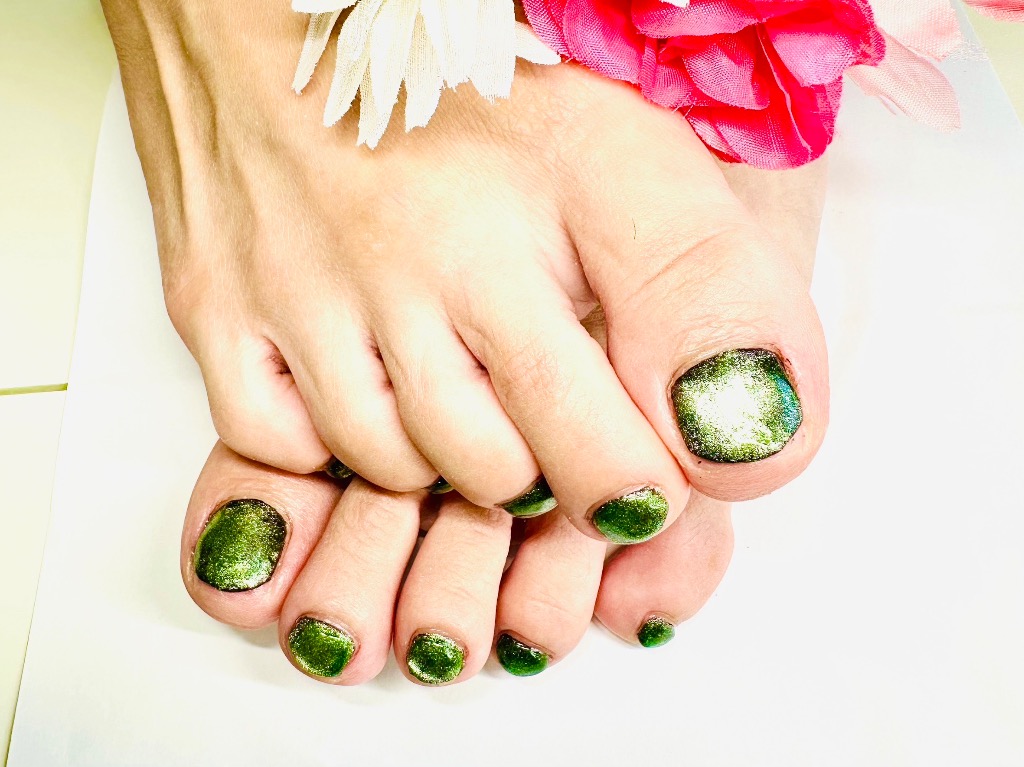 ブラックをベースにグリーンマグネットを重ねたフットネイル💅